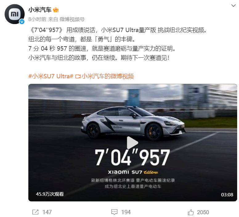 7分04,不是终点,但足够让人热血。小米不是第一辆在纽北刷圈的国产车,但它是第一个让大家真正认真起来的。这场属于中国电车的纽北挑战赛,才刚刚开场。下一个刷进7分内的,会是谁?